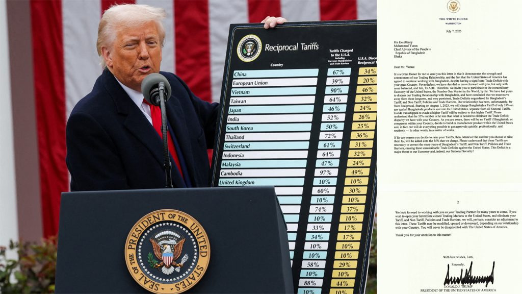 “২০২৫ সালের ১ আগস্ট থেকে বাংলাদেশ থেকে প্রেরিত সব পণ্যের ওপর ৩৫ শতাংশ শুল্ক কার্যকর হবে। এ সিদ্ধান্ত মার্কিন অর্থনীতি ও জাতীয় নিরাপত্তার স্বার্থে নেওয়া হচ্ছে।”
